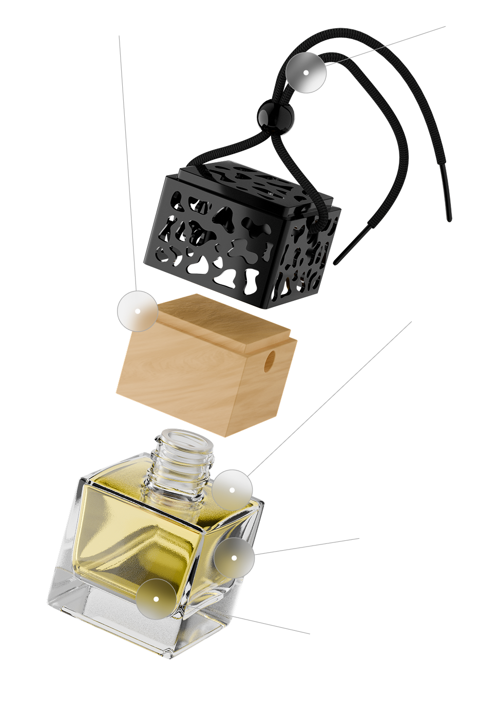 Ein eleganter Autoduft mit Parfüm und nachfüllbarem Holzverschluss.